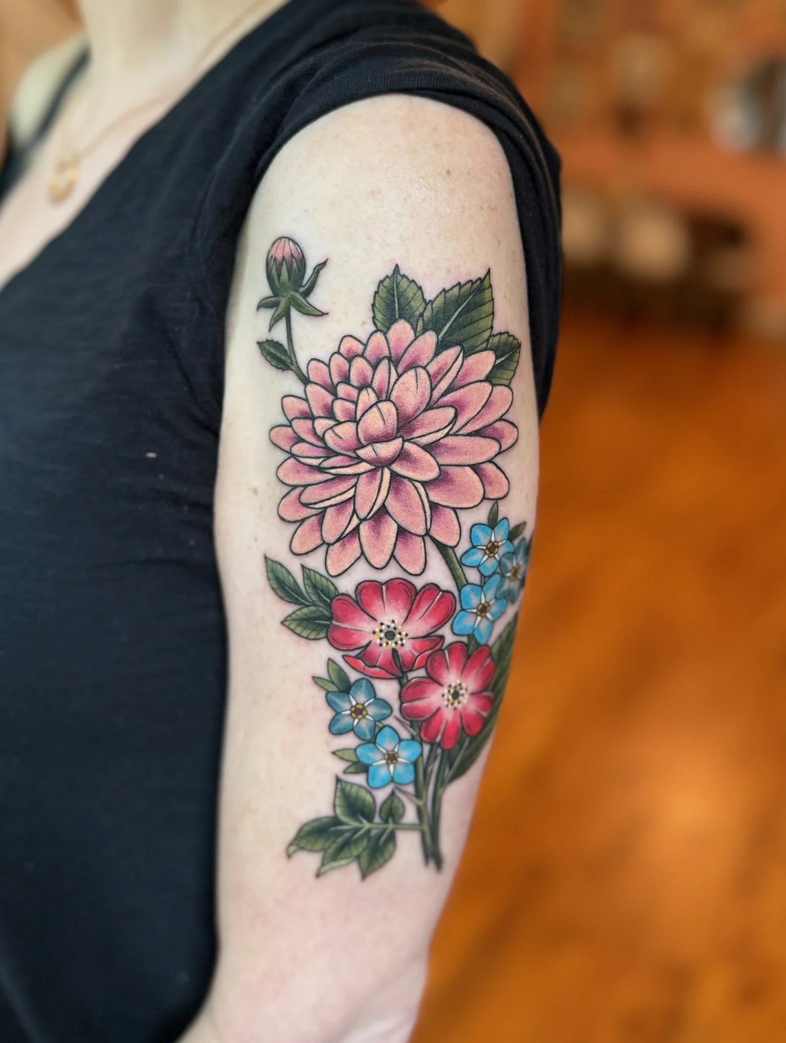 Ren Glass is the founder and owner of Flowerhouse Tattoo. Over the past 17+ years Ren has honed her skills developing a signature style combining illustrative botanicals with a traditional tattoo foundation. Ren’s custom pieces are designed to flow with the body and stand the test of time. Her portfolio includes large scale tattoos as well as smaller, expertly placed pieces in both black & grey and color. Ren also specializes in executing successful cover-up tattoos and working with scars, birth marks, postpartum bodies etc. Additionally, she is passionate about helping clients reclaim their bodies and is trained in trauma-informed tattooing.